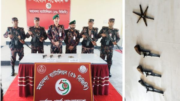 সীমান্তে মহানন্দা ব্যাটালিয়ান ৫৯ বিজিবি কর্তৃক অবৈধ তিনটি বিদেশি ওয়ান শুটার গান ও ৬ রাউন্ড গুলি