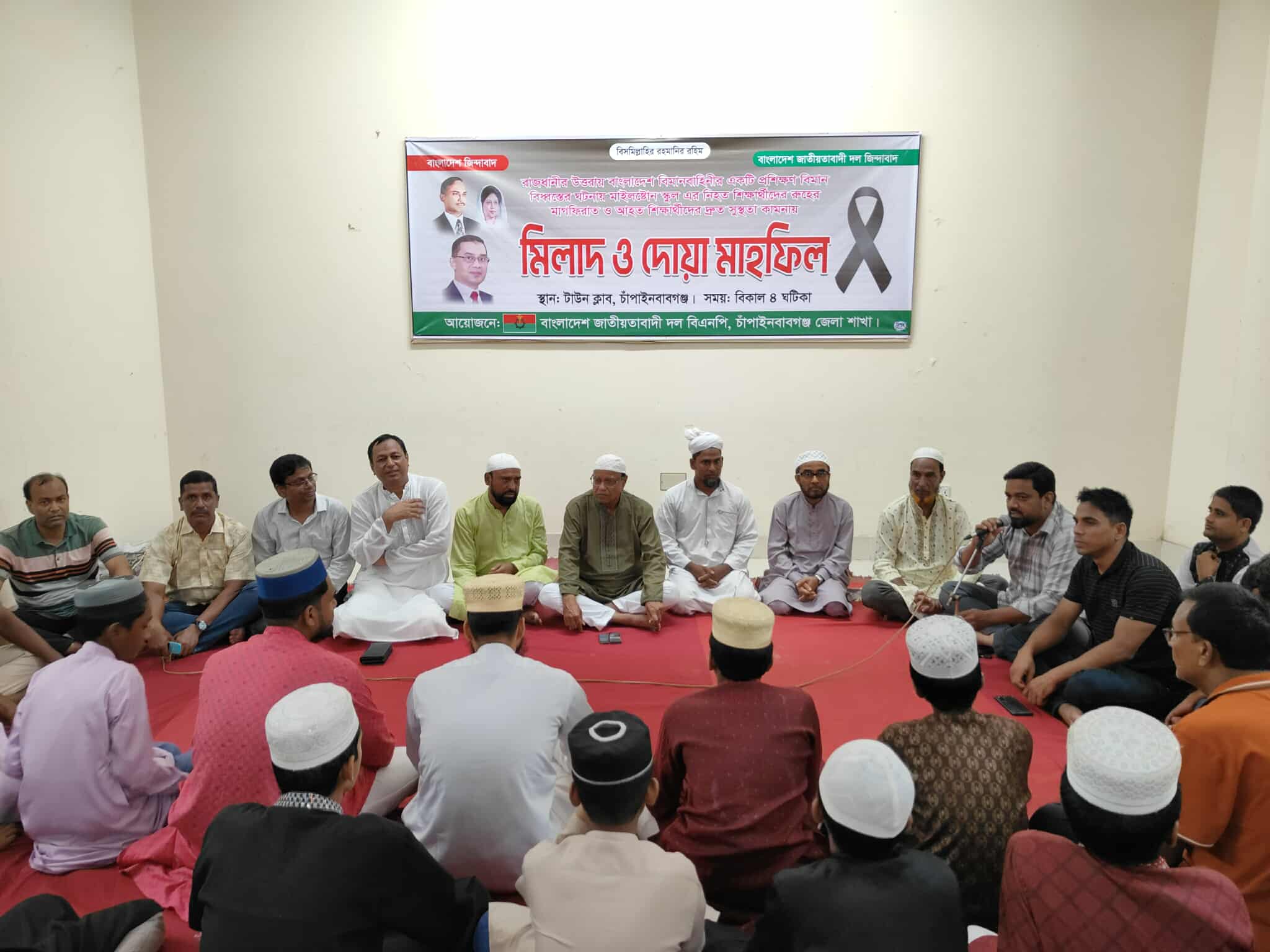 মঙ্গলবার বিকাল ৪টায় চাঁপাইনবাবগঞ্জ টাউন ক্লাবে এ দোয়া মাহফিল অনুষ্ঠিত হয়। অনুষ্ঠানে উপস্থিত ছিলেন কামরুল আরেফিনবুলু, সভাপতি, চাঁপাইনবাবগঞ্জ পৌর বিএনপি, আমিনুল ইসলাম, আহবায়ক, সদর থানা বিএনপি, ওবায়েদ পাঠান সদস্য, জেলা বিএনপি এবং এ এইচ এম এম জামাল বাচ্চু, সেক্রেটারি, পৌর বিএনপি চাঁপাইনবাবগঞ্জ।