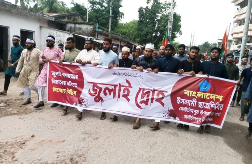 "জুলাই গণহত্যার বিচারের দাবিতে বিক্ষোভ মিছিল ( জুলাই দ্রোহ)-এই স্লোগান লেখা ব্যানার হাতে নিয়ে মিছিলটি বলুহর বাস স্ট্যান্ড থেকে শুরু হয়ে হাসপাতাল রোড, ব্রীজঘাট মোড়, পায়রা চত্বর, পৌর পাঠাগার, পোস্ট অফিস মোড় হয়ে পৌর শহরের গুরুত্বপূর্ণ সড়ক প্রদক্ষিণ করে মেইন স্ট্যান্ডে শেষে হয়। এতে অংশ নেন ইসলামী ছাত্রশিবিরের কোটচাঁদপুর উপজেলা শাখার শতশত নেতাকর্মী।মিছিলে অংশগ্রহণকারীরা অভিযোগ করেন, জুলাই মাসে শত শত নিরীহ মানুষকে গুলি করে হত্যা করা হয়। সেই নৃশংস হত্যাকাণ্ডের বিচার আজও না হওয়ায় তারা গভীর ক্ষোভ প্রকাশ করেন। সমাবেশে প্রধান অতিথির বক্তব্য রাখেন, শিবিরের জেলা সেক্রেটারি উবাইদুর রহমান । তিনি বলেন, “জুলাই মাসে রাষ্ট্রীয় পৃষ্ঠপোষকতায় গণহত্যা চালানো হয়েছিল। আজও সে হত্যাকাণ্ডের বিচার হয়নি। আমরা দোষীদের দৃষ্টান্তমূলক শাস্তি দাবি করছি।”