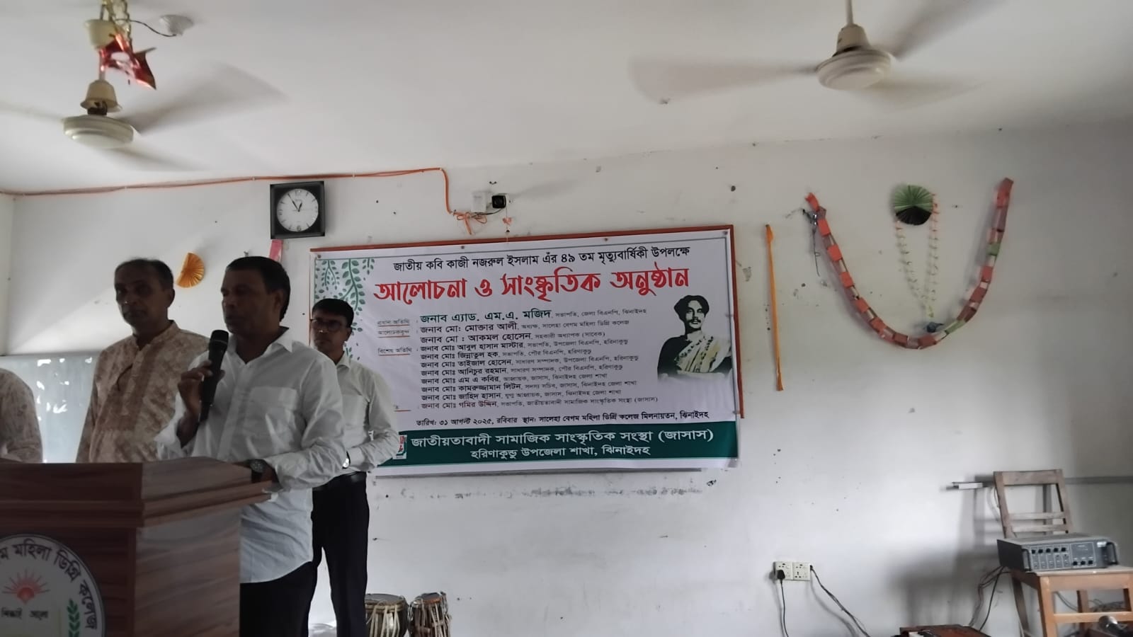 স্টাফ রিপোর্টারঃ জাতীয়তাবাদী সামাজিক সাংস্কৃতিক সংস্থা (জাসাস) হরিণাকুন্ডু উপজেলা শাখার উদ্যোগে জাতীয় কবি কাজী নজরুল ইসলামের ৪৯ তম মৃত্যুবার্ষিকী উপলক্ষে আলোচনা সভা ও সাংস্কৃতিক অনুষ্ঠান অনুষ্ঠিত হয়েছে। রবিবার (৩১ আগস্ট) সকাল ১১ টায় উপজেলার সালেহা বেগম মহিলা ডিগ্রি কলেজ মিলনায়তনে অনুষ্ঠিত সভায় প্রধান অতিথি হিসেবে উপস্থিত ছিলেন ঝিনাইদহ জেলা বিএনপির সভাপতি এড. এম এ মজিদ। হরিণাকুন্ডু উপজেলা জাসাসের সভাপতি গমির উদ্দিনের সভাপতিত্বে অনুষ্ঠিত সভায় বিশেষ অতিথি ছিলেন, সরকারি কলেজের অবসরপ্রাপ্ত অধ্যক্ষ শিক্ষাবিদ মোহাব্বত হোসেন টিপু, সালেহা বেগম কলেজের অধ্যক্ষ মোক্তার আলী,সহকারী অধ্যাপক (অবঃ) আকমল হোসেন নান্নু,হরিণাকুন্ডু উপজেলা বিএনপির সভাপতি আবুল হাসান মাস্টার,সাধারণ সম্পাদক