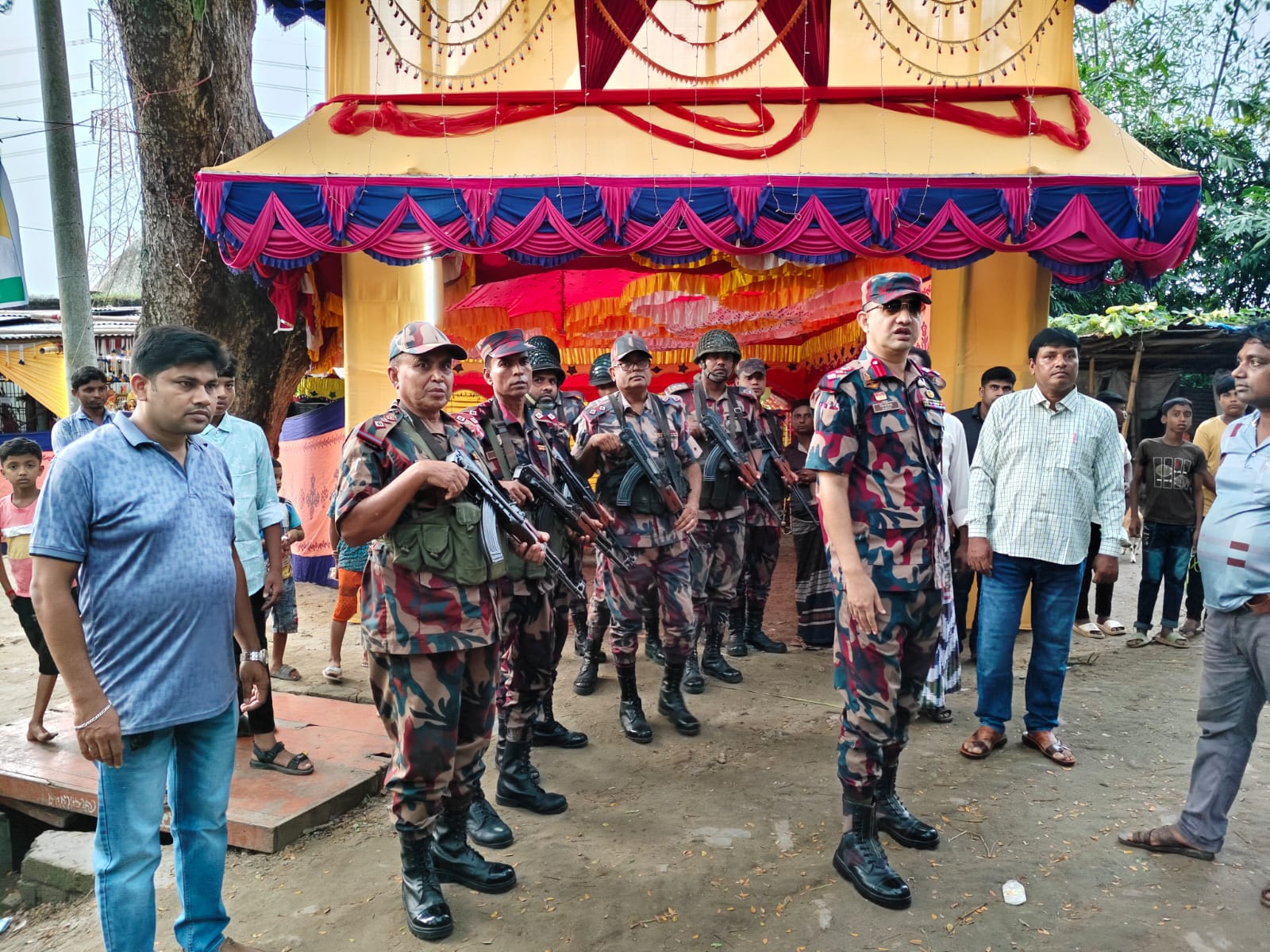 মাহিদুল ইসলাম ফরহাদ:চাঁপাইনবাবগঞ্জ:চাঁপাইনবাবগঞ্জের সীমান্তবর্তী এলাকার দুর্গাপূজার মন্ডপের নিরাপত্তায় ৬ প্লাটুন বিজিবি সদস্য মোতায়েন করা হয়েছে। পূজা বিসর্জন পর্যন্ত মন্ডপ ও আশেপাশের এলাকায় সার্বক্ষণিক নিরাপত্তা দেবে বিজিবি সদস্যরা। বিজিবি কর্মকর্তারা বলছেন- সীমান্ত এলাকায় দুর্গাপূজাকে ঘিয়ে কোন অপ্রীতিকর ঘটনার আশঙ্কা নেই।
