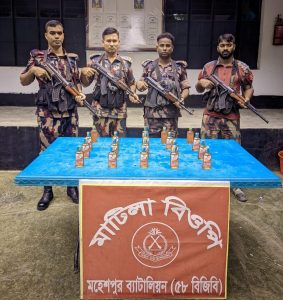 মাটিলা, গয়েশপুর, শ্রীনাথপুর ও খোসালপুর বিওপির বিভিন্ন স্থানে পরিচালিত অভিযানে ১৯ বোতল ভারতীয় মদ, ৩১ বোতল Win Cerex Syrup এবং ২৭৬ পিচ ভারতীয় ভায়াগ্রা ট্যাবলেট জব্দ করা হয়েছে।অভিযানগুলো নেতৃত্ব দেন সুবেদার শরীফ মনিরুজ্জামান, নায়েব সুবেদার সৈয়দ মফিজুর রহমান, নায়েক মোঃ সাইফুল ইসলাম ও হাবিলদার মোঃ নুরুজ্জামান। অভিযানের সময় ৭ জন বাংলাদেশী নাগরিককে আটক করা হয়, এর মধ্যে ২ জন পুরুষ, ৩ জন নারী এবং ১ শিশু অন্তর্ভুক্ত। আটককৃতদের মহেশপুর থানায় হস্তান্তর প্রক্রিয়া চলমান রয়েছে।