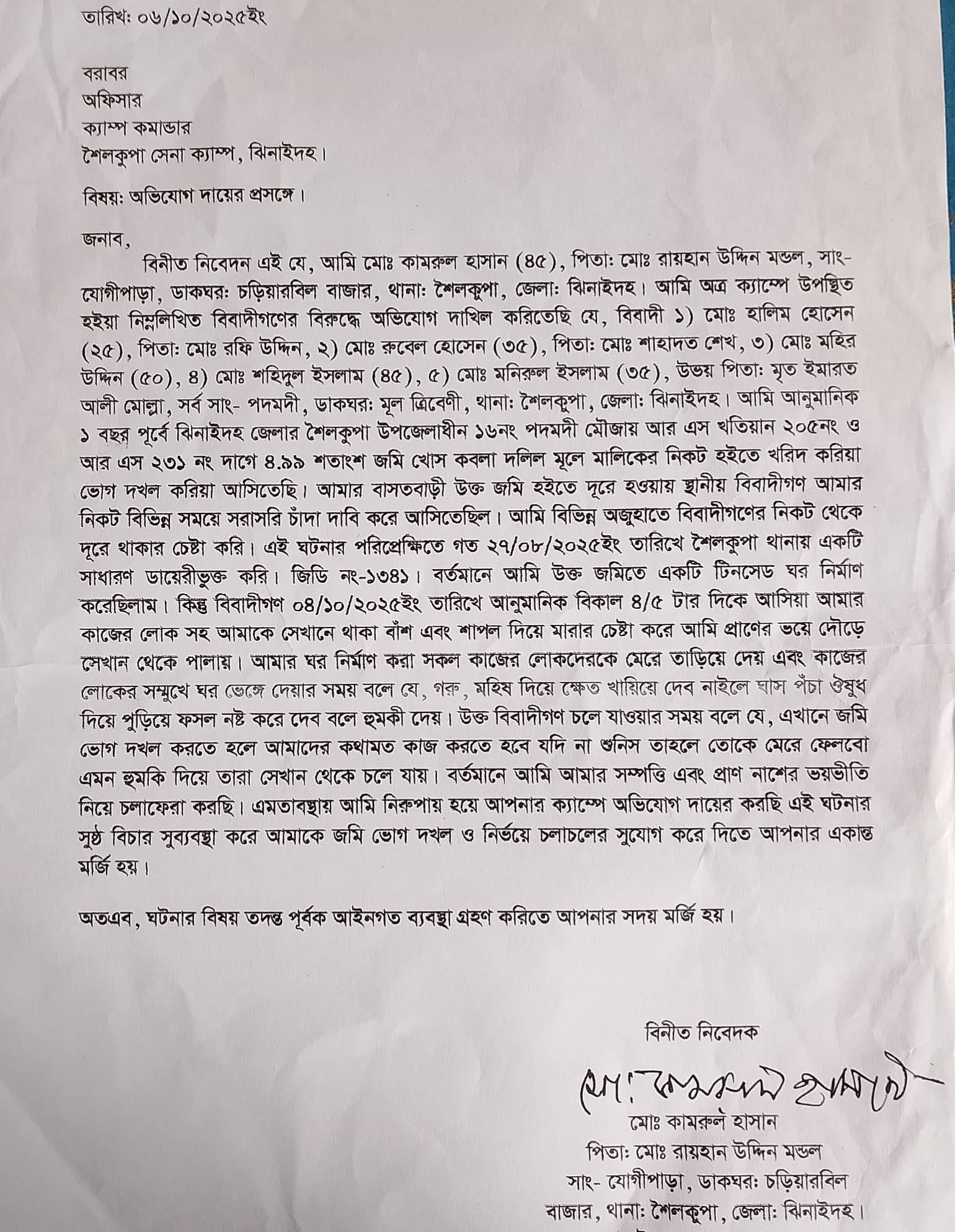 উপায়ন্ত না পেয়ে কামরুল হাসান গত ২৭ আগষ্ট ২০২৫ তারিখে শৈলকুপা থানায় একটি সাধারণ ডায়েরি করেন। ডায়েরি নং-১৩৪১।