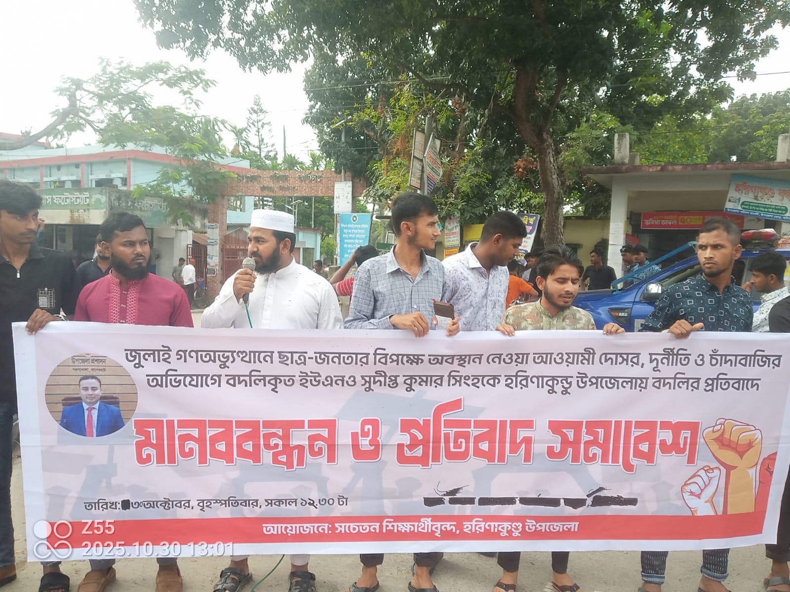 মানববন্ধনে বক্তারা বলেন,জুলাই গণহত্যায় ছাত্র-জনতার বিরুদ্ধে অবস্থান নেওয়া আওয়ামী লীগের দোষর দুর্নীতি ও চাঁদাবাজির অভিযোগে বদলিকৃত ইউএনও সুদীপ্ত কুমার সিংহকে হরিণাকুন্ডু উপজেলায় বদলি করা হয়েছে। আওয়ামী লীগের এই দোষর বদলিকৃত ইউএনও সুদীপ্ত কুমার সিংহের বদলির আদেশ অতি দ্রুত প্রত্যাহার করতে হবে। না করা হলে কঠোর থেকে কঠিনতম পদক্ষেপ গ্রহণ করা হবে বলে ঘোষনা দেন মানববন্ধন থেকে নেতৃবৃন্দ । বর্তমানে হরিণাকুন্ডুতে ইউএনও যোগদান করাকে ঘিরে উত্তেজনা বিরাজ করছে।