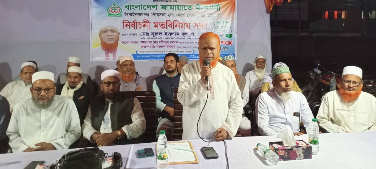 চাঁপাইনবাবগঞ্জ-৩ (সদর) আসনের পৌরশহরের ২নং ওয়ার্ডে জামায়াতে ইসলামীর নির্বাচনী মতবিনিময় সভা করেন। সভাস্থলটি হাজার-হাজার নারী পুরুষের উপস্থিতিতে মুখরিত। চাঁপাইনবাবগঞ্জ পৌর আমীর হাফেজ গোলাম রাব্বানীর সভাপতিত্বে রবিবার রাতে অনুষ্ঠিত মতবিনিময় সভায় প্রধান অতিথি হিসেবে উপস্থিত ছিলেন চাঁপাইনবাবগঞ্জ-৩ আসনে জামায়াত মনোনীত সংসদ সদস্য পদপ্রার্থী সাবেক ভিপি নূরুল ইসলাম বুলবুল। বিশেষ অতিথি ছিলেন জেলা নায়েবে আমীর ও সাবেক এমপি অধ্যাপক মো. লতিফুর রহামন এবং চাঁপাইনবাবগঞ্জ পৌরসভার সাবেক মেয়র অধ্যক্ষ মো. নজরুল ইসলাম। এছাড়াও চাঁপাইনবাবগঞ্জ সদর ও পৌর শাখা জামায়াতে ইসলামীর দায়িত্বশীল নেতৃবৃন্দ বক্তব্য রাখেন। উক্ত সভায় প্রধান অতিথি বলেন, জামায়াতে ইসলামী কোনো ব্যক্তি বা পরিবারের রাজনীতি করে না, জামায়াতে ইসলামী গণমানুষের কল্যাণে রাজনীতি করে। জামায়াতে ইসলামী একটি কল্যাণ ও মানবিক বাংলাদেশ জাতিকে উপহার দিতে চায়। এজন্য জনগণ আগামী নির্বাচনে জামায়াতে ইসলামীকে রাষ্ট্র পরিচালনার সুযোগ দিতে হবে। তবেই জাতিকে ক্ষুধা, দারিদ্র, বেকারত্ব, দুর্নীতি, সন্ত্রাস, চাঁদাবাজ মুক্ত এক নতুন বাংলাদেশ উপহার দেবে। তিনি আরোও বলেন, অতীতে যারা ক্ষমতায় ছিল,তাদের নেতৃত্বই ছিল দুর্নীতিগ্রস্ত, চাঁদাবাজ-সন্ত্রাসের গডফাদার। তাদের শাসনামলে জাতি দেখেছে, তারা দেশকে দুর্নীতিতে টানা ৫ বার বিশ্ব চ্যাম্পিয়ানে করেছে। নূরুল ইসলাম বুলবুল বলেন, ‘যাদের কাছে নিজ দলের নেতাকর্মী নিরাপদ নয়; তাদের কাছে দেশ ও জাতি নিরাপদ থাকতে পারবে না’। বাংলাদেশকে শান্তির নীড় হিসেবে গড়ে তুলতে দাঁড়িপাল্লা প্রতীকে ব্যালটে ভোট দিয়ে ইসলামী বিপ্লব ঘটাতে হবে। জামায়াতে ইসলামী ক্ষমতায় গেলে বেকারত্ব দূরীকরণে যুব সমাজকে উদ্যোক্ত হিসেবে গড়ে তোলা হবে। যুব নারী-পুরুষকে কর্মমূখী প্রশিক্ষণ প্রদানের মাধ্যমে প্রত্যেককে জাতীয় সম্পদে রূপান্তরিত করা হবে। ঘরে বসেই উর্পাজনের সুযোগ পাবে চাঁপাইনবাবগঞ্জের প্রতিটি মানুষ। জনগণের কল্যাণে চাঁপাইনবাবগঞ্জের শহর ও গ্রামকে সমানভাবে গড়ে তোলা হবে। কৃষক, শ্রমিক, মেহনতি মানুষের কল্যাণে সকল বৈষম্যের শিকল ভেঙে দিয়ে দলমত, ধর্ম-বর্ণ, জাতি-গোষ্ঠী নির্বিশেষে সমান সুযোগ সুবিধা নিশ্চিত করা হবে। মহানন্দা ও পদ্মা নদী ভাঙ্গন রোধে প্রয়োজনীয় পদক্ষেপ গ্রহন করে পর্যটন কেন্দ্র গড়ে তোলা হবে৷ বিশুদ্ধ পানির অভাব দূর করা হবে। ছাত্র ও তরুণ যুব সমাজের নেতৃত্বে নতুন বাংলাদেশের রোল মডেল হিসেবে চাঁপাইনবাবগঞ্জকে গড়ে তোলা হবে।