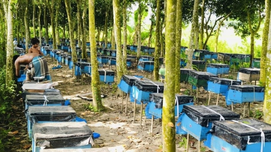 মোঃ মাসুদ রানা কুমিল্লা জেলা প্রতিনিধি .কুমিল্লার তিতাসে ভ্রাম্যমাণ মধু চাষ করে বছরে ৭-৮লাখ টাকা আয় করছেন সাতক্ষীরা জেলার শ্যামনগর উপজেলার ট্যাংরা খালী গ্রামের বাসিন্দা মোঃ ফরিদ হোসেন। তিনি মৌসুম অনুযায়ী বিভিন্ন বাগানে মৌ-বাক্স স্থাপন করে মধু সংগ্রহ করেন।জানা যায়, একজন শ্রমিক ও এক কিশোর বালকসহ ফরিদ হোসেন মৌমাছির পরিচর্যার কাজ করছেন। তিনি জানান, পাঁচ বছর আগে মৌ-বাক্স স্থাপনের মাধ্যমে মধু সংগ্রহ শুরু করেন। নিজ জেলায় বাগান লিজ নিয়ে মৌ-বাক্স স্থাপন করে মধু চাষ করে সাফল্যের পর বিভিন্ন জেলার বিভিন্ন উপজেলায় ঘুরে ঘুরে তিনি মৌমাছি পালন করে মধু চাষ করেন।