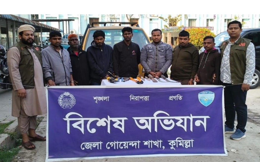 গ্রেফতারকৃতরা হলেন— দাউদকান্দি উপজেলার টামটা গ্রামের ৬টি ডাকাতি মামলার আসামি মো. সাদ্দাম হোসেন (৩২), কোতোয়ালি থানার আলেখারচর এলাকার ৭ মামলার আসামি মো. সুমন (৩০), বুড়িচং উপজেলার ৫ মামলার আসামি মো. নজরুল ইসলাম দুলাল (২৮), ফেনী সদর উপজেলার রামপুর গ্রামের ৬ মামলার আসামি মো. সোলেমান ওরফে রুবেল (৩৫), নোয়াখালীর কবিরহাট এলাকার ৭ মামলার আসামি ফকির আহমেদ ওরফে আলাউদ্দিন (৫৫), লক্ষ্মীপুর জেলার রায়পুর থানার চর আবাবিল গ্রামের ৭ মামলার আসামি মামুনুর রশিদ সোহাগ (৩৫) এবং ভোলার চরফ্যাশন উপজেলার বজলু বাজার গ্রামের ৮ মামলার আসামি মো. শাহীন (২৫)।ডিবি পুলিশ জানায়, জেলার দাউদকান্দি উপজেলার ইলিয়টগঞ্জ বাজারে ১৪–১৫ জনের একটি আন্তঃজেলা ডাকাত দল ডাকাতির প্রস্তুতি নিচ্ছিল। এ সময় ডিবির এসআই পবিত্র সরকার, এসআই তৌকিক হোসেন ও এসআই অর্ণব কুমার সঙ্গীয় ফোর্সসহ সেখানে অভিযান চালান। অভিযানে ৭ ডাকাতকে গ্রেফতার করা হয়। এ সময় তাদের কাছ থেকে ১টি দেশীয় তৈরি এলজি (অস্ত্র), ২ রাউন্ড বারবোর কার্তুজ, ১টি লোহার কাটার, ১টি লোহার হাইড্রোলিক কাটার, ১টি কাঠের বাটযুক্ত লোহার ধামা, ১টি লোহার ছেনি, ১টি লোহার দা ও ২টি ছুরি উদ্ধার করা হয়।