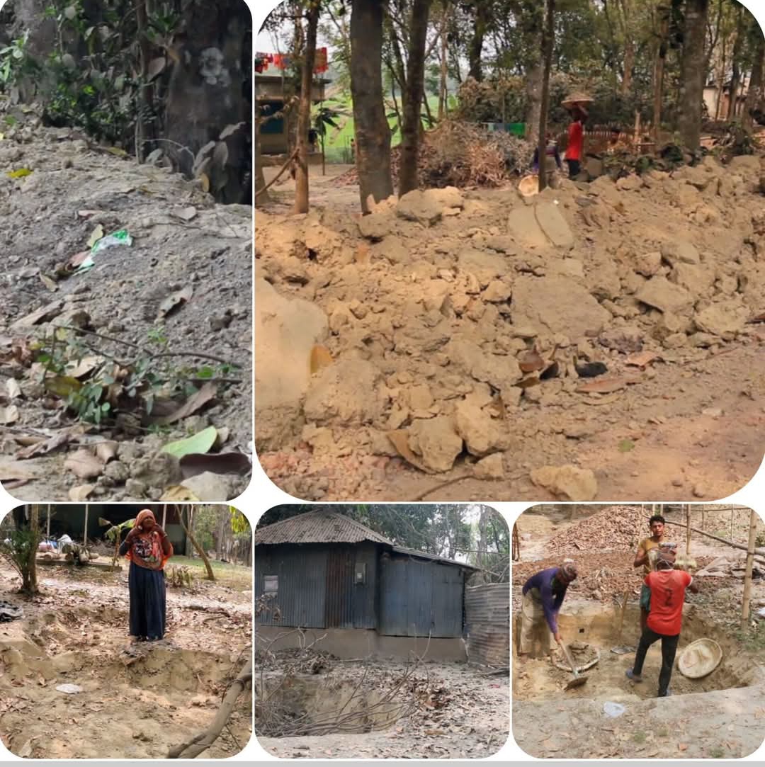 একই গ্রামের আকলিমা খাতুন বলেন,‘ঘরের সাথেই বড় গর্ত করা হয়েছে। বৃষ্টিতে ঘর ভেঙে গর্তে পড়ে যাওয়ার ভয়ে আছি। ঠিকাদারকে একাধিকবার বারণ করলেও শোনেনি।’