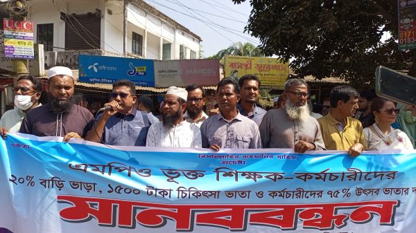 শৈলকূপায় কলেজ শিক্ষক ও মাধ্যমিক কর্মচারীদের ভাতা বৃদ্ধির দাবিতে মানববন্ধন।