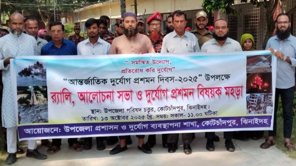 আব্দুল্লাহ বাশার,, কোটচাঁদপুর প্রতিনিধি: “সমন্বিত উদ্যোগ, প্রতিরোধ করি দুর্যোগ” এই প্রতিপাদ্য নিয়ে ঝিনাইদহের কোটচাঁদপুরে আন্তর্জাতিক দুর্যোগ প্রশমন দিবস-২০২৫ উপলক্ষে র্যালি, আলোচনা সভা ও দুর্যোগ প্রশমন বিষয়ক মহড়া অনুষ্ঠিত হয়েছে।