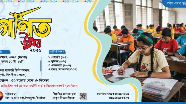 এ.এস আব্দুস সামাদ শৈলকুপা ঝিনাইদহ প্রতিনিধিঃ ঝিনাইদহের শৈলকুপায় শিক্ষার্থীদের যুক্তিবোধ, সৃজনশীলতা ও গণিতচর্চাকে আরও উৎসাহিত করতে আবারও অনুষ্ঠিত হতে যাচ্ছে ম্যাথ অলিম্পিয়াড–২০২৫। প্রতি বছরের মতো এ বছরও আয়োজন করেছে স্থানীয়