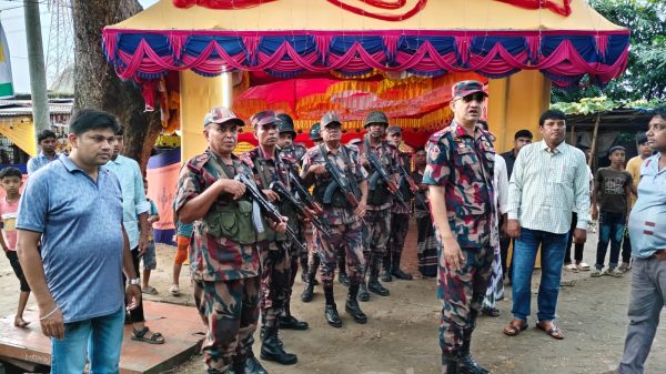 মাহিদুল ইসলাম ফরহাদ:চাঁপাইনবাবগঞ্জ:চাঁপাইনবাবগঞ্জের সীমান্তবর্তী এলাকার দুর্গাপূজার মন্ডপের নিরাপত্তায় ৬ প্লাটুন বিজিবি সদস্য মোতায়েন করা হয়েছে। পূজা বিসর্জন পর্যন্ত মন্ডপ ও আশেপাশের এলাকায় সার্বক্ষণিক নিরাপত্তা দেবে বিজিবি সদস্যরা। বিজিবি কর্মকর্তারা বলছেন-